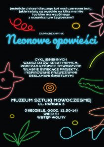 „Neonowe opowieści” to cykl sześciu spotkań, których uczestnicy stworzą prace, inspirowane prawdziwymi reklamami świetlnymi. Prace, które podobnie jak neony – będą świecić w ciemności!