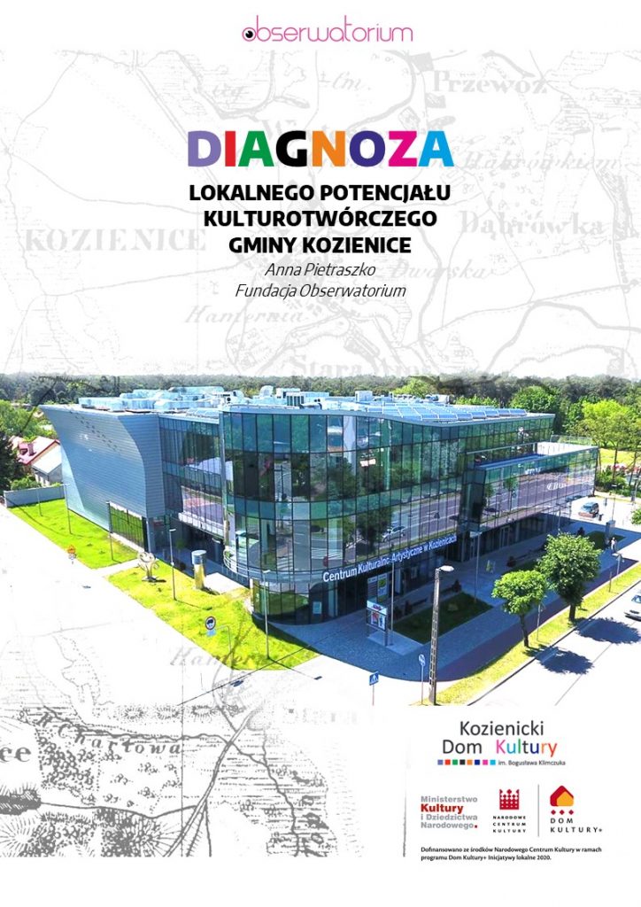 „Diagnoza lokalnego potencjału kulturotwórczego Miasta i Gminy Kozienice” to dokument, który opracowaliśmy na rzecz projektu „Razem dla kultury w Gminie Kozienice!” (czas realizacji: marzec –czerwiec 2020 roku), realizowanego przez Kozienicki Dom Kultury im. Bogusława Klimczuka, w ramach Programu Narodowego Centrum Kultury Domy Kultury + Inicjatywy lokalne 2020.