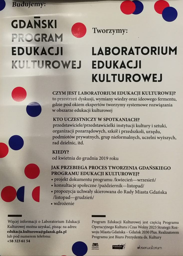 Fundacja Obserwatorium przeprowadziła cykl działań diagnostyczno-warsztatowych, których efektem było stworzenie Gdańskiego Programu Edukacji Kulturowej.